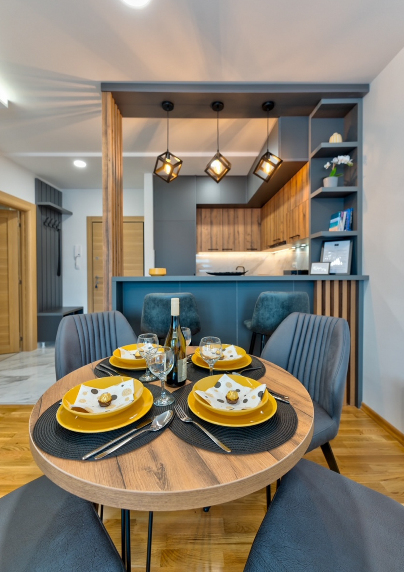 Apartman je moderno opremljen za boravak do 4 osobe. Sastoji se od kuhinje, kupatila, spavaće sobe, dnevnog boravka i terase. Takođe, obezbeđeno je parking mesto u garaži iz koje se dolazi liftom do apartmana.