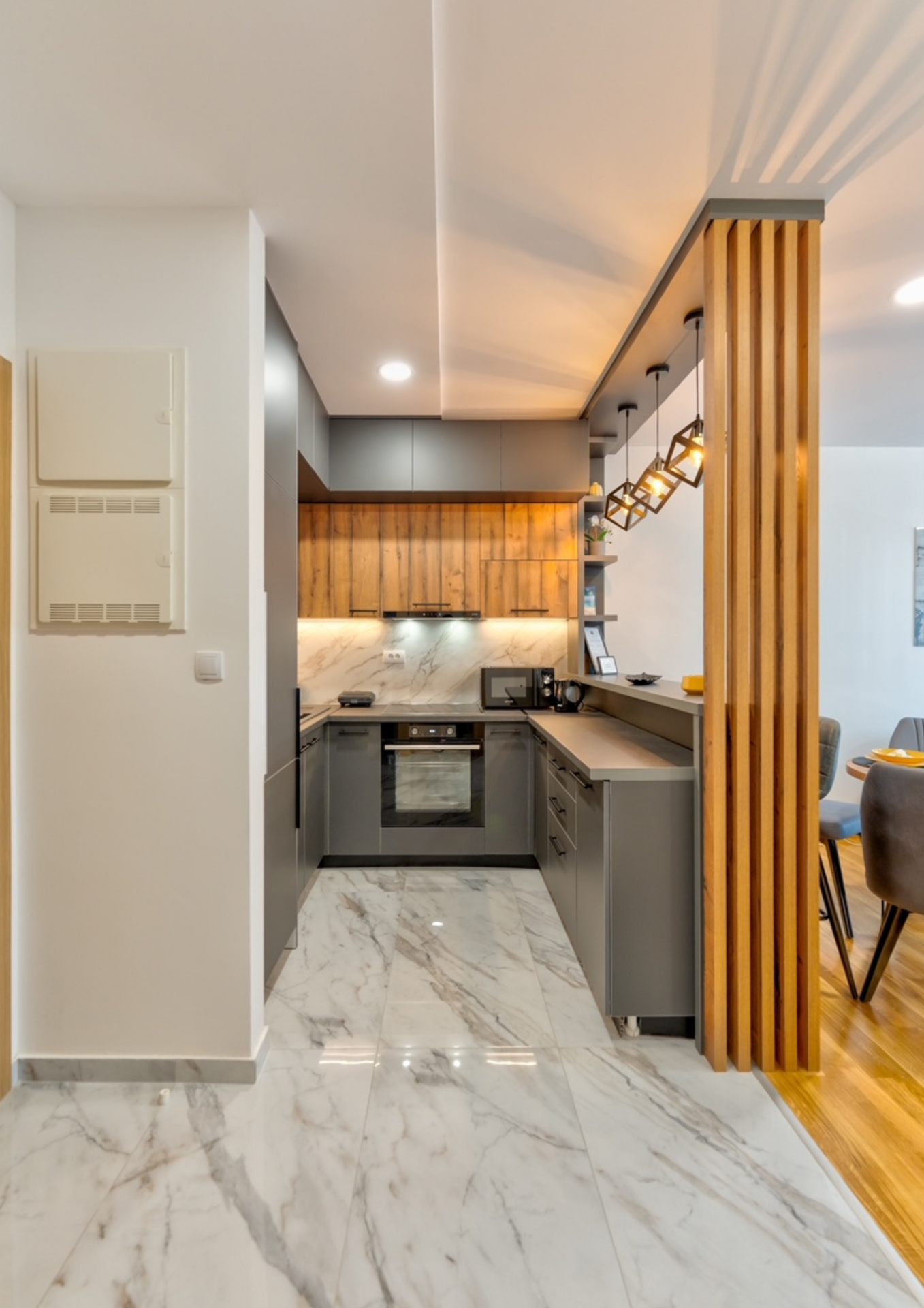 Kuhinja je kompletno opremljena za samostalnu pripremu hrane, poseduje rernu, kombinovani frižider, mikrotalasnu, toster, ketler. Obezbeđeni su peškiri, posteljine, pegla, veš mašina, fen.